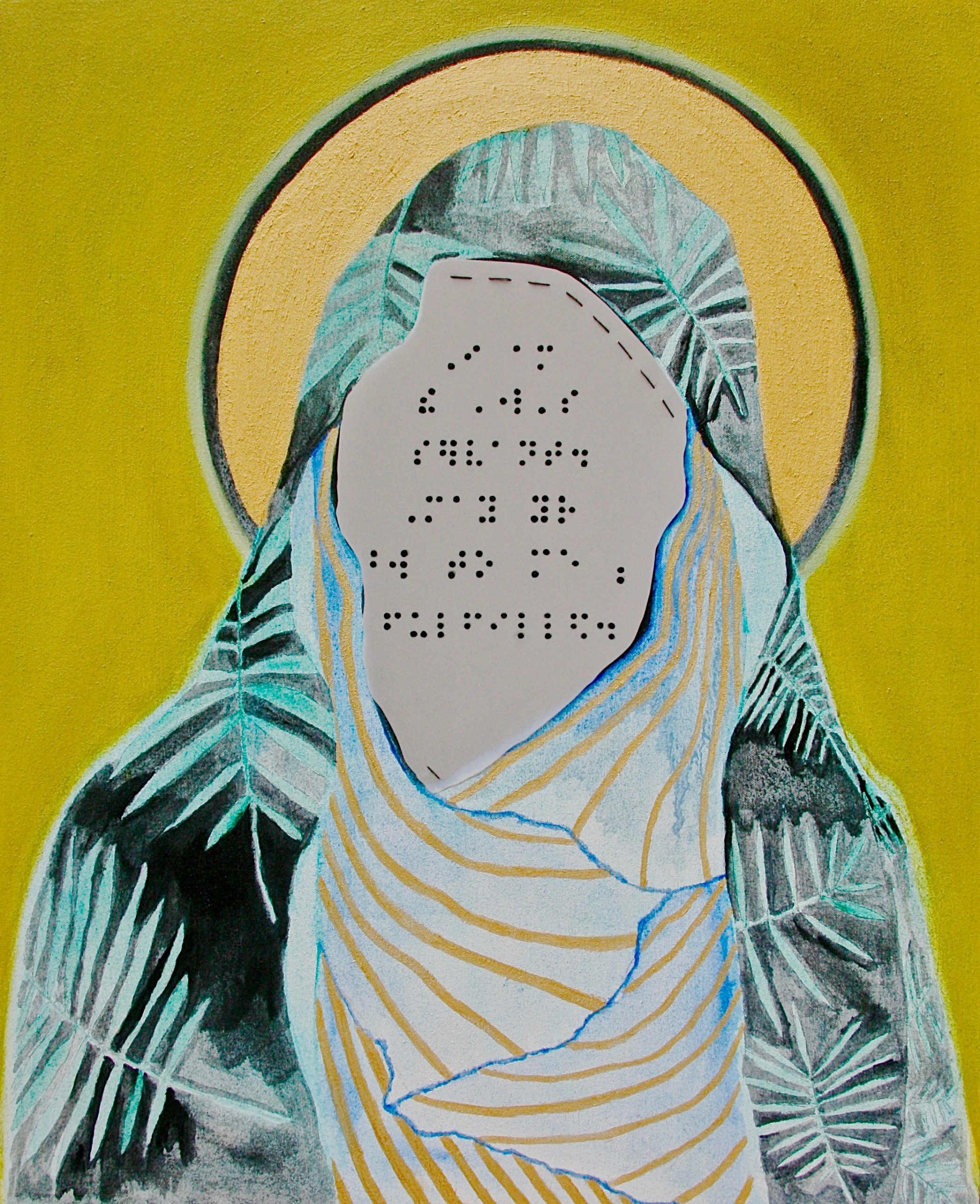 Oil, mylar, and thread on canvas, 18" x 22", 2019