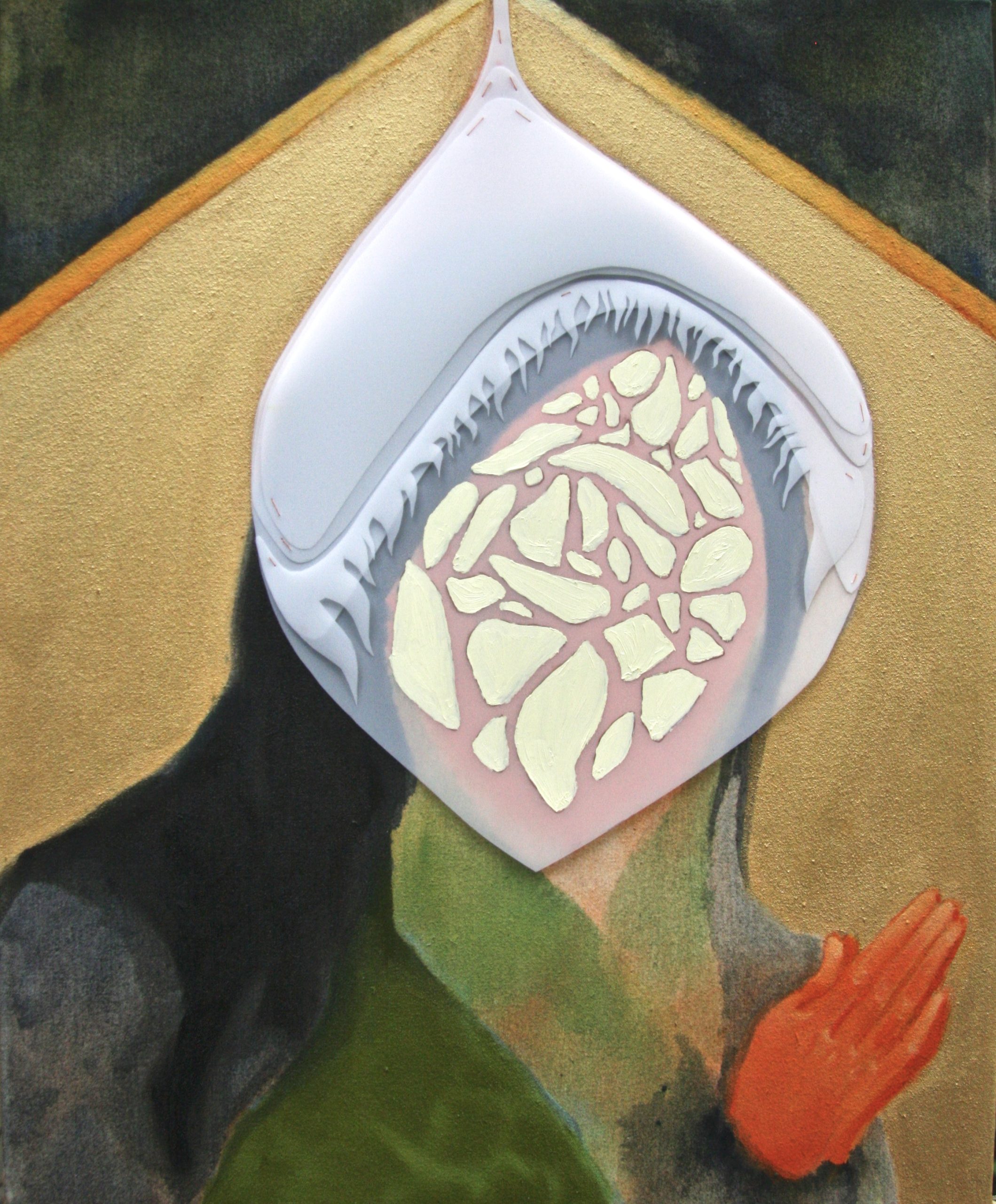 Oil, gouache, Dura-Lar film, and thread on canvas, 18" x 22", 2018