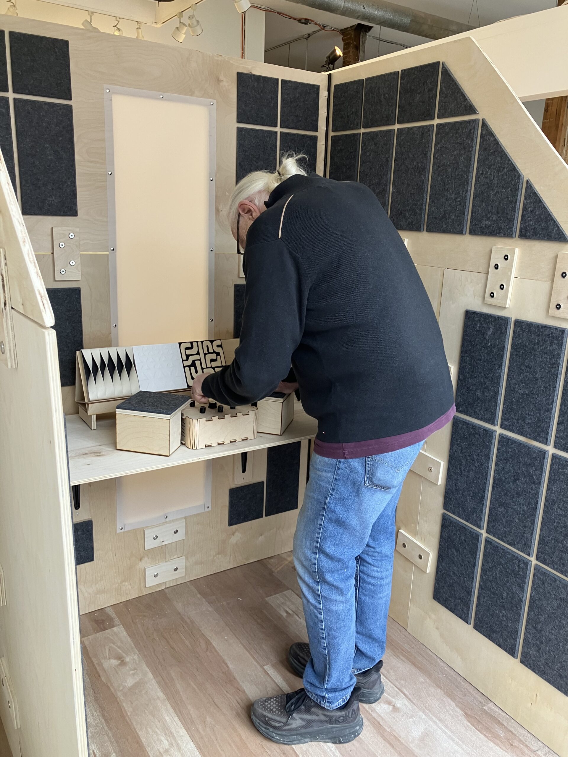 The synthesizer and a collection of paired tactile artworks that serve as prompts are located within the installation where the hidden translator inside communicates through sound and vibration to the audience outside, composing a multi-sensory language. The “translator” is the active interpreter of the tactile prompts, while the passive “listener” receives what is being communicated, imagining the forms of the tactile artworks that inspired the message. Both active and passive participants are essential for acknowledging one’s thoughts through encoded messages, emphasizing the need to pay attention to the other’s expression carefully, and to listen with an open, creative mind, especially towards marginalized voices with communication barriers. By using a mode of communication which is somewhat abstracted from traditional linguistic methods, the piece also examines how the mind deciphers meaning from unexpected multi-sensory patterns. I’m especially interested in learning from blind and Deaf audiences in order to observe the way their interpretation of abstraction differs from sighted and hearing audiences.